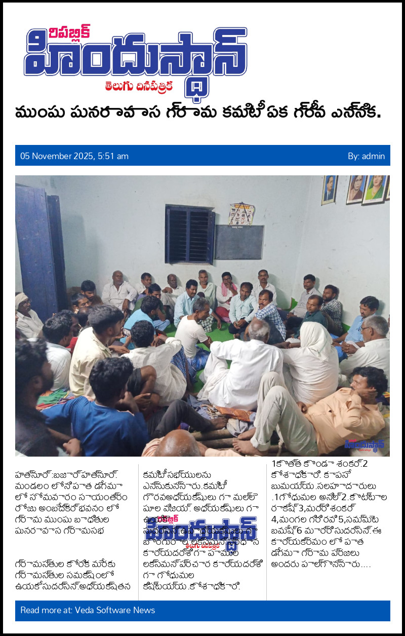 మండలం లోని పాత డేగమా లో సోమవారం సాయంత్రం రోజు అంబేద్కర్ భవనం లో గ్రామ ముంపు బాధితుల పునరావాస గ్రామసభ గ్రామస్తుల కోరిక మేరకు గ్రామస్తుల సమక్షంలో ఉయకే సుదర్సన్.అధ్యక్షతన కమిటీ సభ్యులను ఎన్నుకున్నారు.కమిటీ గౌరవఅధ్యక్షులు గా మల్లె పూల విజయ్. అధ్యక్షులు గా ఉయికె సుదర్సన్.ఉపాధ్యక్షులు గా బొంగురాల లక్సమన్.ప్రధాన కార్యదర్శి గా పాముల లక్సమన్ ప్రచార కార్యదర్శి గా గోధుమల కిష్టయ్య.కోశాధికారి. 1కొత్త కొండా శంకర్.2 కోశాధికారి. కాపసే బుమయ్య.సలహాదారులు .1గోధుమల అనిల్ 2.కొట్టాల రాకేష్ 3,మర్రి శంకర్ 4,మంగల గిరి రవి 5,సమ్మెట బమేష్ 6 మార్రి సుదర్సన్.ఈ కార్యక్రమం లో పాత డేగమా గ్రామ ప్రజలు అందరు పాల్గొన్నారు.