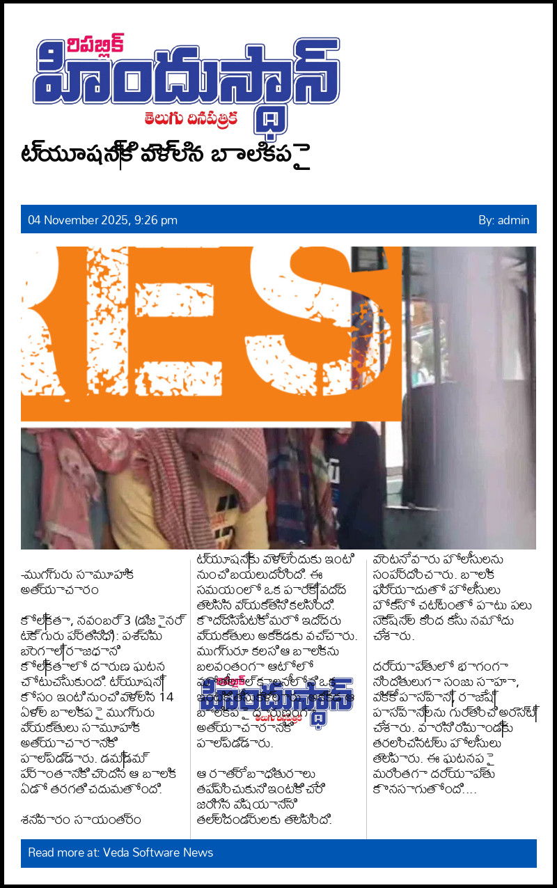 కోల్‌కతా, నవంబర్ 3 (డిజైనర్ టెక్ గురు ప్రతినిధి): పశ్చిమ బెంగాల్‌ రాజధాని కోల్‌కతాలో దారుణ ఘటన చోటుచేసుకుంది. ట్యూషన్‌ కోసం ఇంటి నుంచి వెళ్లిన 14 ఏళ్ల బాలికపై ముగ్గురు వ్యక్తులు సామూహిక అత్యాచారానికి పాల్పడ్డారు. డమ్‌డమ్ ప్రాంతానికి చెందిన ఆ బాలిక ఏడో తరగతి చదువుతోంది.