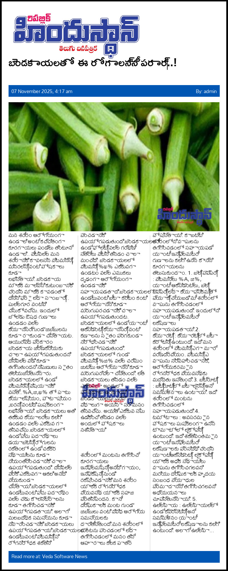 మన శరీరం ఆరోగ్యంగా ఉండాలి అంటే కచ్చితంగా కూరగాయలు పండ్లు తింటూనే ఉండాలి.. వీటివల్ల మన శరీరానికి కావలసిన విటమిన్స్, మినరల్స్ వంటి పోషకాలు కూడా లభిస్తాయి..బెండకాయ మొక్క మాల్వేసి కుటుంబానికి చెందిన మొక్క కావడంతో దీనిని ఫ్రై లేదా సాంబార్.. పుల్లగూర వంటివి చేసుకోవచ్చు. ఇందులో బోలెడు ఔషధ గుణాలు ఉండడం వల్ల క్యాన్సర్గుండె జబ్బులను కూడా రాకుండా చేస్తాయట. ఆయుర్వేద ప్రకారం బెండకాయ జీర్ణక్రియకు చాలా ఉపయోగపడుతుందని దీనివల్ల వేడి కూడా తగ్గుతుందని నిపుణులు సైతం తెలియజేస్తున్నారు. బెండకాయలలో ఉండే విటమిన్స్ విషయానికి వస్తే..%A,జ,ఖ% తో పాటు క్యాల్షియం, పొటాషియం ,ఐరన్ వంటిది పుష్కలంగా లభిస్తాయి. బెండకాయలు అతి తక్కువ క్యాలరీలు కలిగి ఉండడం వల్ల ఎక్కువ గా తినవచ్చు.బెండకాయలలో ఉండే పీచు పదార్థాలు డయాబెటిస్ రోగులను రక్తంలో ఉండే చక్కెర స్థాయిలను కూడా నియంత్రించడానికి చాలా ఉపయోగపడుతుంది. దీనివల్ల వీరికి ఎక్కువగా ఆకలి అనేది వేయకుండా చేస్తాయి.బెండకాయలలో ఉండేటువంటి పీచు పదార్థం వల్ల చెడు కొలెస్ట్రాలను కూడా తగ్గించడానికి ఉపయోగపడతాయి. అలాగే మలబద్ధక సమస్యను కూడా నివారించడానికి బెండకాయలు ఉపయోగపడతాయి.బెండకాయలలో ఉండేటువంటి విటమిన్ సి రోగనిరోధక శక్తిని పెంచడానికి ఉపయోగపడుతుంది.బెండకాయలలో ఉండే ఫోలేట్ వల్ల గర్భిణీ స్త్రీలు వీటిని తినడం చాలా మంచిది. బెండకాయలలో విటమిన్ %ఖ% ఎక్కువగా ఉండటం వల్ల ఎముకలు దృఢంగా ఆరోగ్యంగా ఉండడానికి సహాయపడతాది.బెండకాయలలో ఉండేటువంటి బీటా కెరీటం కంటి ఆరోగ్యాన్ని కూడా మెరుగుపరచడానికి చాలా ఉపయోగపడుతుందట. బెండకాయలలో ఉండే యాంటీ ఆక్సిడెంట్ క్యాన్సర్ వంటి కణాలను సైతం పెరగకుండా నిరోధించడానికి ఉపయోగపడుతుంది. బెండకాయలలో గుండె విటమిన్-%జ% వల్ల చర్మం జుట్టు ఆరోగ్యాన్ని కూడా మెరుగుపరిచేలా చేస్తుంది. లేత బెండకాయలు తినడం వల్ల ఎక్కువగా అందులో పోషకాలు ఉంటాయి.. బెండకాయలను ఎన్ని విధాలుగా అయినా సరే మనం తినవచ్చు. అయితే ఎక్కువ సేపు ఉడికించి తినడం వల్ల అందులో పోషకాలు నశిస్తాయి